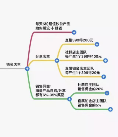 当普通店主发展20个直接下线店主后,即可升级为“优质店主”。优质店主除享受普通店主的自用、分享销售产品的返利外,还有3项额外权益:发展下线店主,人头费奖金从100元涨至200元;下线店主“裂变”发展新的店主,优质店主可获得每人100元的人头费奖金,且这个下线关系可以延伸无限级;还可以获得整个团队网体全部店主20%销售佣金收益。