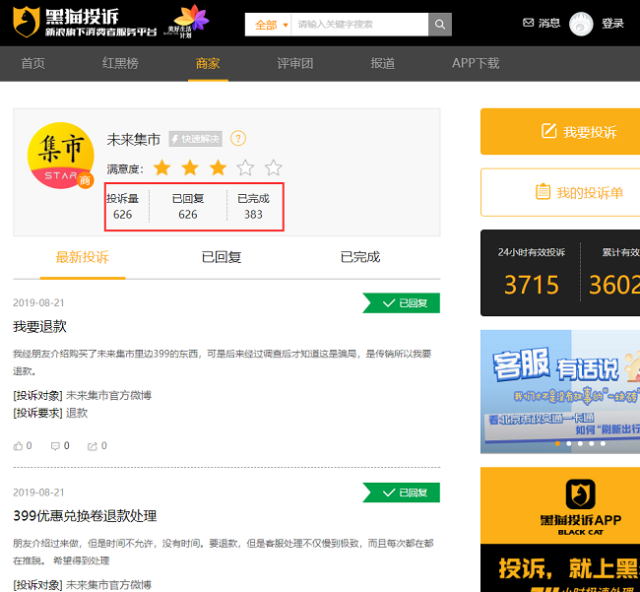 未来集市上市至今(2019年8月21日),累计投诉数量高达626条,可谓是劣迹斑斑。