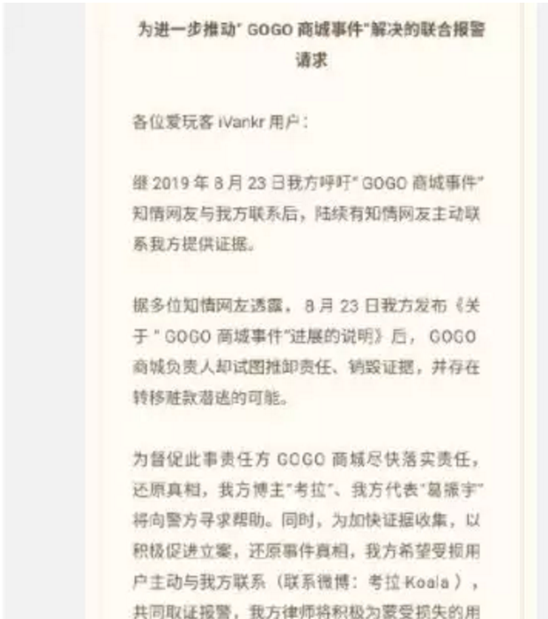 有几百名忠实粉丝,在其推广的“GOGO商城”中下单购买了电子产品,涉及金额高达上千万。但此后,商城并未发货,消费者才发现该商城没有退款按钮,根本无法退款。此后,该商城发布声明,称受到行业调整影响他们要“良性退出市场”,已将用户的下单金额转为“借款”,借款将在三年内还清。