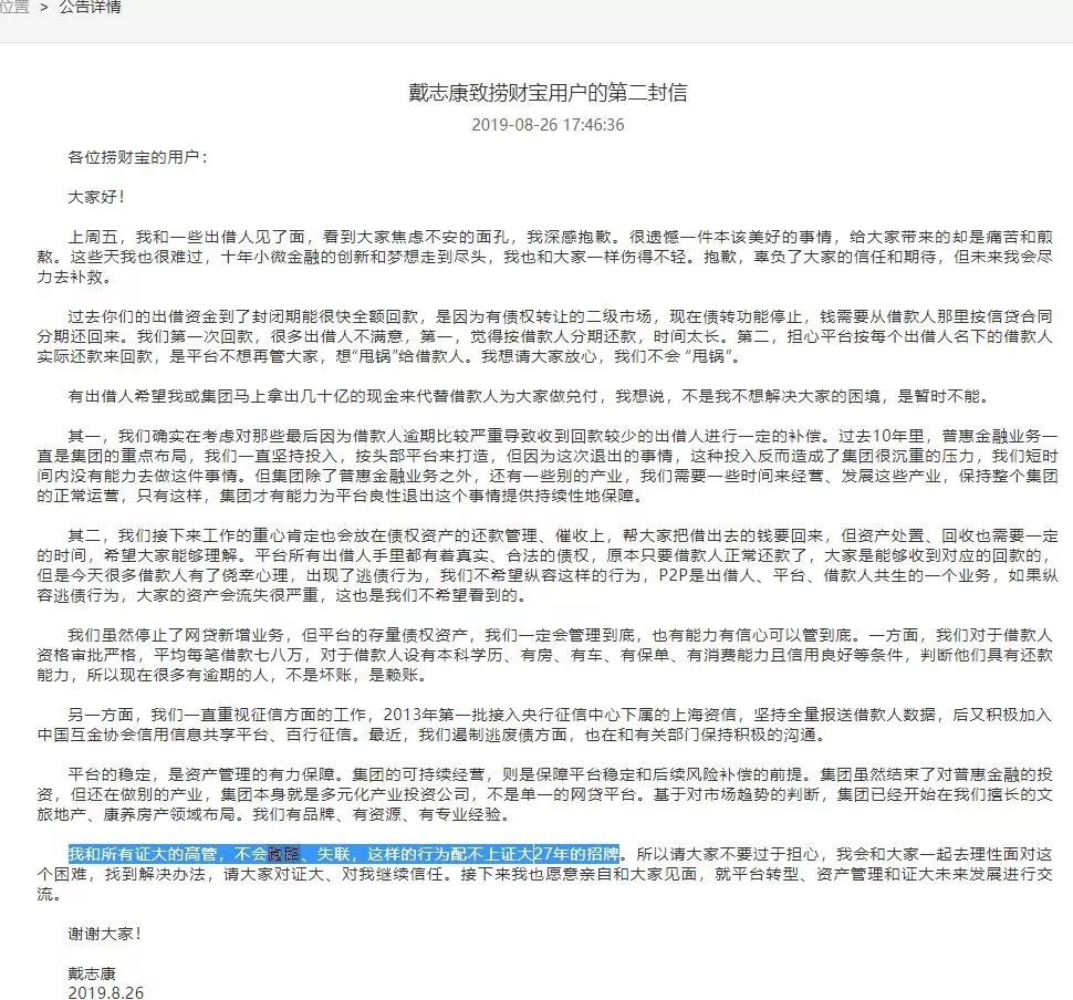 8月14日,证大旗下网贷平台“捞财宝”停止了新增业务。8月26日,证大集团董事长戴志康在捞财宝官网发布了一封致用户信,称自己和证大所有高管不会跑路、失联,“平台的存量债权资产,我们一定会管理到底,也有能力有信心可以管到底。”