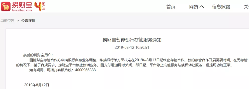 此前,“捞财宝”官网曾发布公告表示:“因捞财宝存管合作方华瑞银行自身业务调整,华瑞银行单方面决定在8月13日起终止存管合作。”