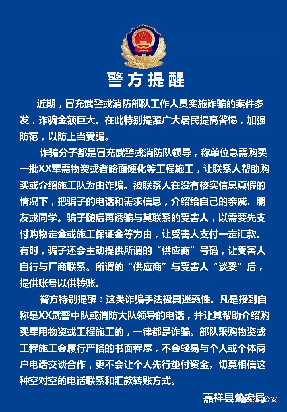 近期,冒充武警或消防部队工作人员实施诈骗的案件多发,诈骗金额巨大。嘉祥公安在此特别提醒广大居民提高警惕,加强防范,以防上当受骗。