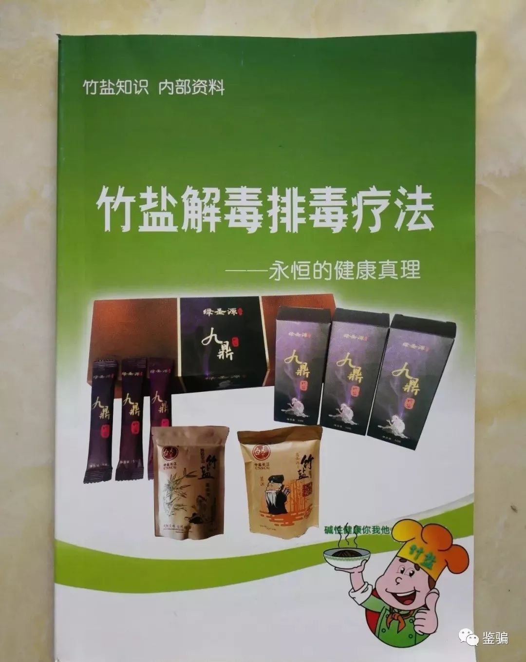 鉴骗从一份内部资料上了解到,绿时代公司主打九鼎竹盐产品。并宣称竹盐含有丰富的矿物质和微量元素,因而呈碱性,PH值在9-11,而体内毒素是酸性的。酸碱可以中和,中和就可以达到可以排毒,解毒的功效。竹盐除了可以排毒外还可以减肥,让糖尿病初期患者不治而愈。很明显,竹盐只是食用盐并不是药品,绿时代公司如此宣传,已经涉嫌虚假宣传。