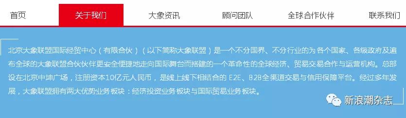 在其官网上,有这样一段企业简介:“北京大象联盟国际经贸中心(有限合伙)(以下简称大象联盟)是一个不分国界、不分行业的为各个国家、各级政府及遍布全球的大象联盟合伙伙伴更安全便捷地走向国际舞台而搭建的一个革命性的全球经济、贸易交易合作与运营机构。总部设在北京中坤广场,注册资本10亿元人民币,是线上线下相结合的 E2E、B2B全渠道交易与信用保障平台。经过多年发展,大象联盟拥有两大优势业务板块:经济投资业务板块与国际贸易业务板块。”