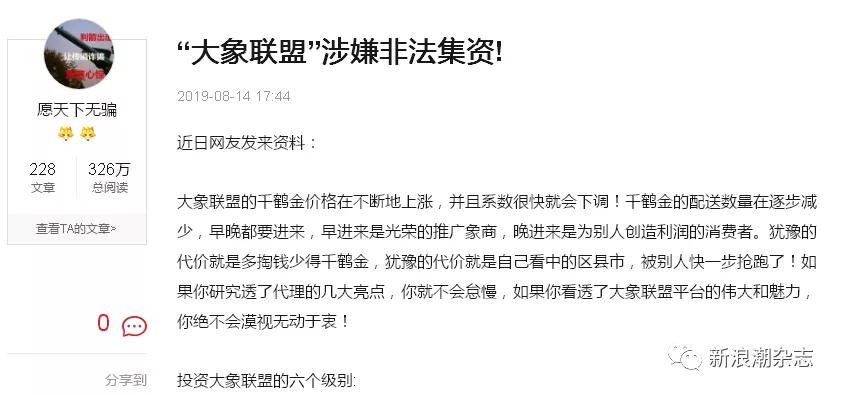 近日,有自媒体账号发文《“大象联盟”涉嫌非法集资》。文中说,有网友发来资料,“大象联盟的千鹤金价格在不断地上涨,并且系数很快就会下调!千鹤金的配送数量在逐步减少,早晚都要进来,早进来是光荣的推广象商,晚进来是为别人创造利润的消费者。”但分析其制度后作者认为,“根据我国禁止传销条例,该模式的奖金制度和禁止传销条例有冲突。”