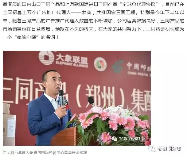 也就是说,目前,已有万名象商。这一点,也得到了大象联盟自己方面的认可。在“大象联盟订阅号”发布的《大象联盟携手中国邮政在郑州落地中国首个“三同产品集配中心”》一文中,大象联盟董事长金成龙表示,“目前已在全国招募上万个广告推广代理人——象商,共推国家三同工程。特别是今年下半年以来,随着三同产品的广告推广代理人数量的不断增加,公司运营数据良好,三同产品的市场销量也在日益激增。”