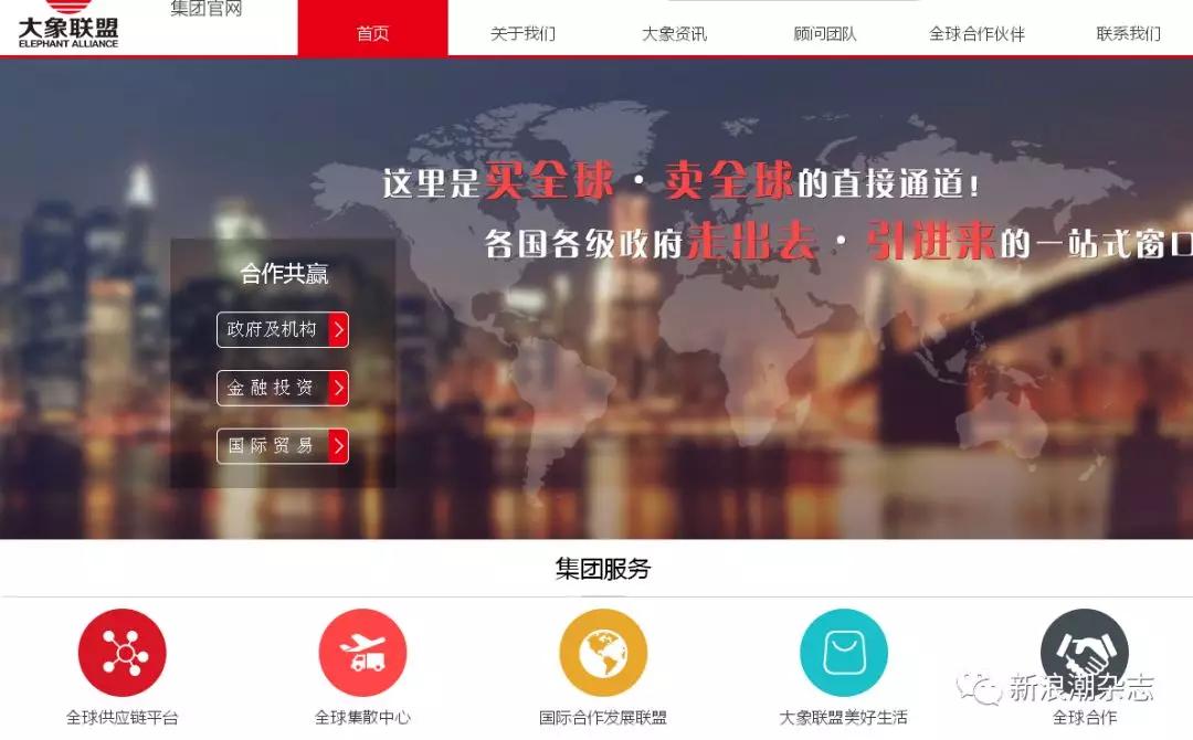 官网所示,大象联盟集团服务共五项:全球供应链平台、全球集散中心、国际合作发展联盟、大象联盟美好生活以及全球合作。