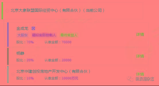 记者从天眼查看到,该公司由三个股东,分别是金成龙、杨静、北京中建创投房地产开发中心(有限合伙),而北京中建创投房地产开发中心(有限合伙)是金成龙控股80%的公司。值得注意的是,大象联盟三个股东都是认缴资金。