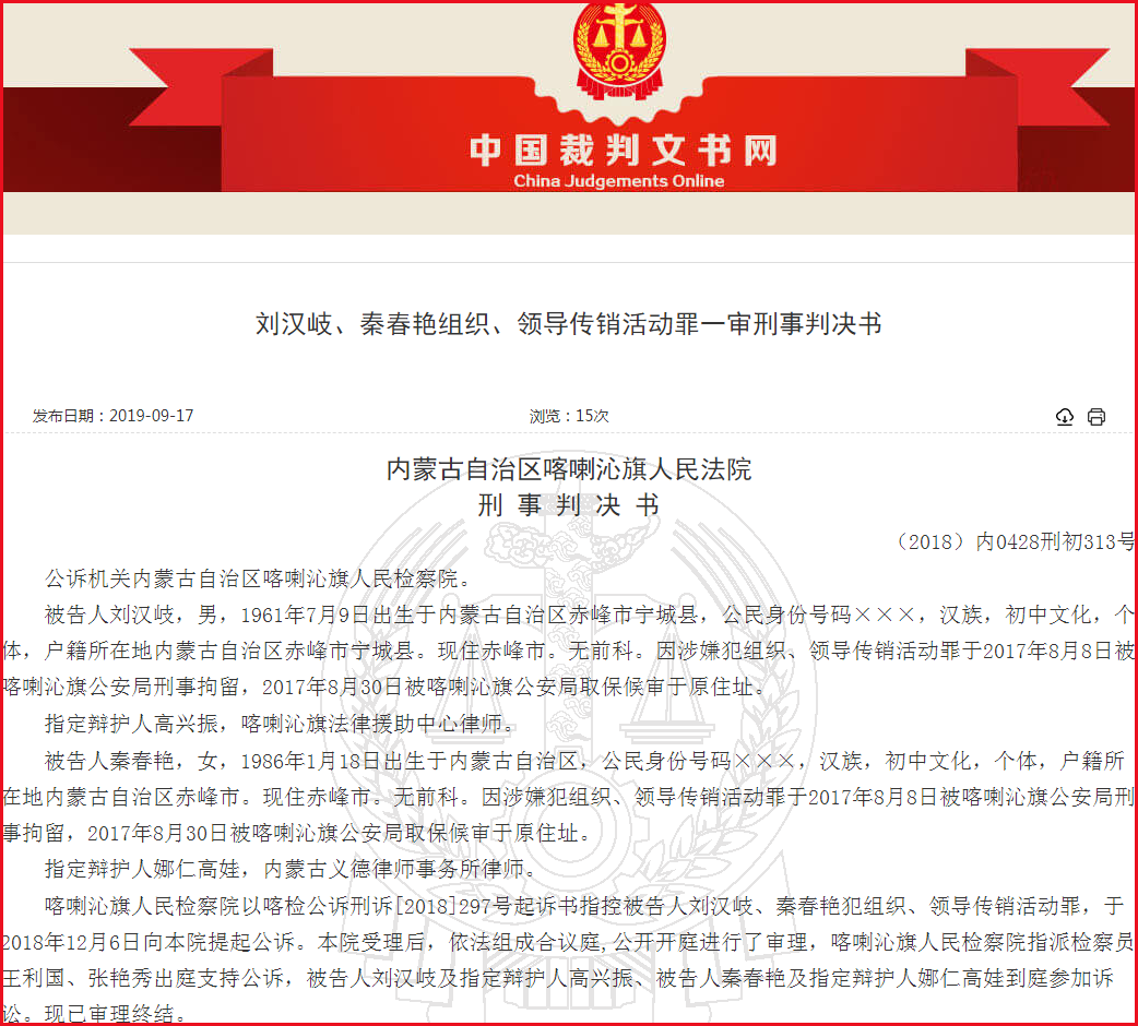 近日,喀喇沁旗人民法院依照相关法律的规定,以组织、领导传销活动罪,判处刘汉岐有期徒刑二年零六个月,缓刑三年,并处罚金六万元;判处秦春艳有期徒刑二年,缓刑二年零六个月,并处罚金三万元。