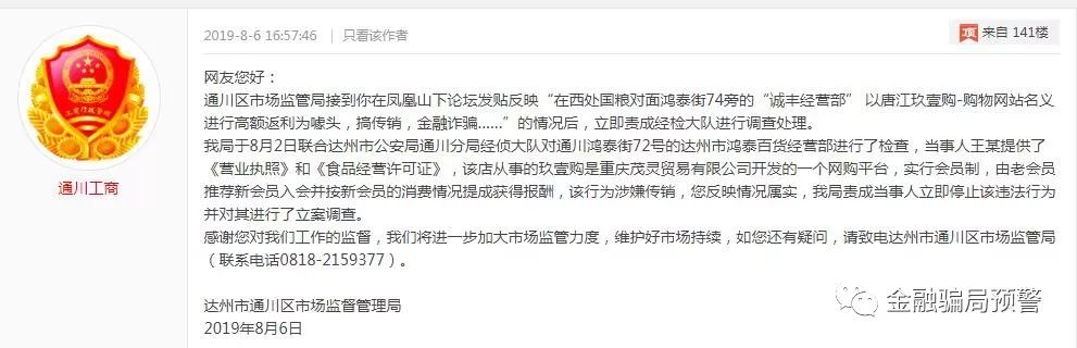 我局于8月2日联合达州市公安局通川分局经侦大队对通川鸿泰街的达州市鸿泰百货经营部进行了检查,当事人王某提供了《营业执照》和《食品经营许可证》,该店从事的“玖壹购”是重庆茂灵贸易有限公司开发的一个网购平台,实行会员制,由老会员推荐新会员入会并按新会员的消费情况提成获得报酬,该行为涉嫌传销,您反映情况属实,我局责成当事人立即停止该违法行为,并对其进行了立案调查。