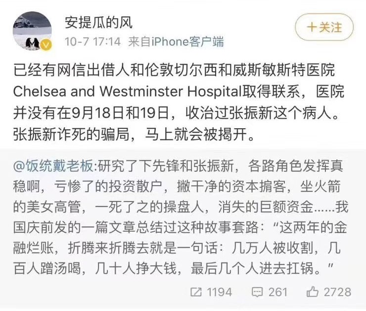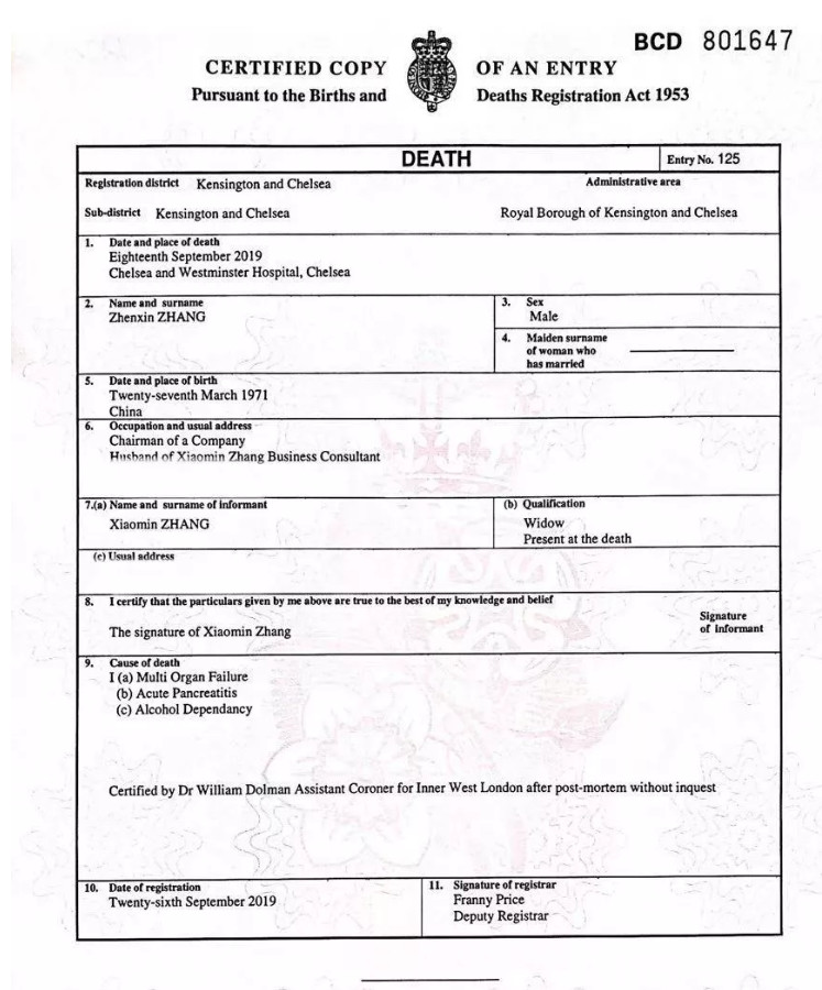 10月5日晚,网信官微发布《讣告》称,先锋集团董事长、网信集团实际控制人张振新先生因多脏器衰竭、酒精依赖、急性胰腺炎经抢救无效,于伦敦时间2019年9月18日在英国伦敦切尔西和威斯敏斯特医院去世,享年48周岁。