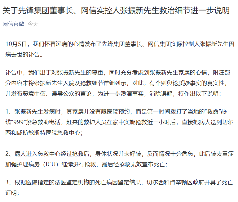 网信官微内容指出,10月5日发布的讣告,出于对张振新先生的尊重,同时充分考虑到张振新先生家属的心情,附注部分内容未将张振新先生入院及抢救细节详细列示,对此,有个别舆论质疑事实的真实性,并发布恶意中伤、误导公众的言论,为进一步澄清事实,消除误解,发布了今日说明内容。