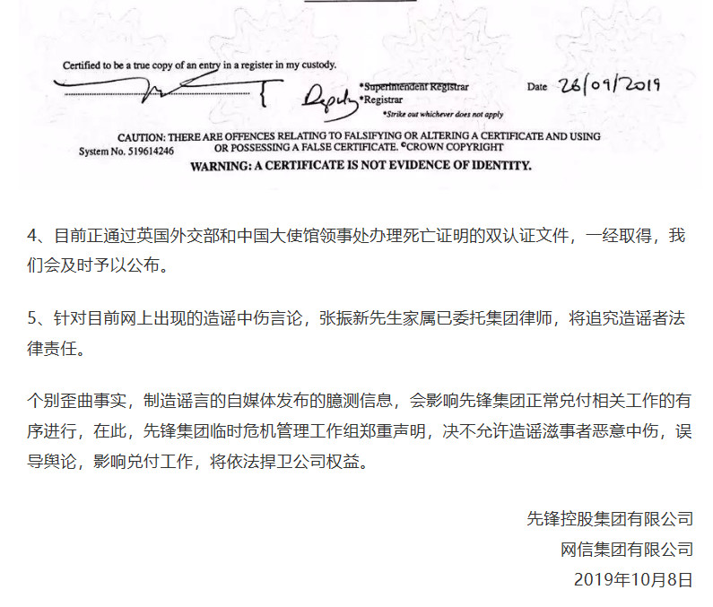 针对投资人和舆论对张振新“猝死”一事真假的怀疑,10月8日凌晨,网信官微再次发布《关于先锋集团董事长、网信实控人张振新先生救治细节进一步说明》,就先锋集团董事长张振新在家中病倒后,实施的一系列抢救,以及死亡证明,做了进一步的明确说明。