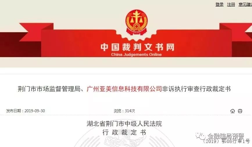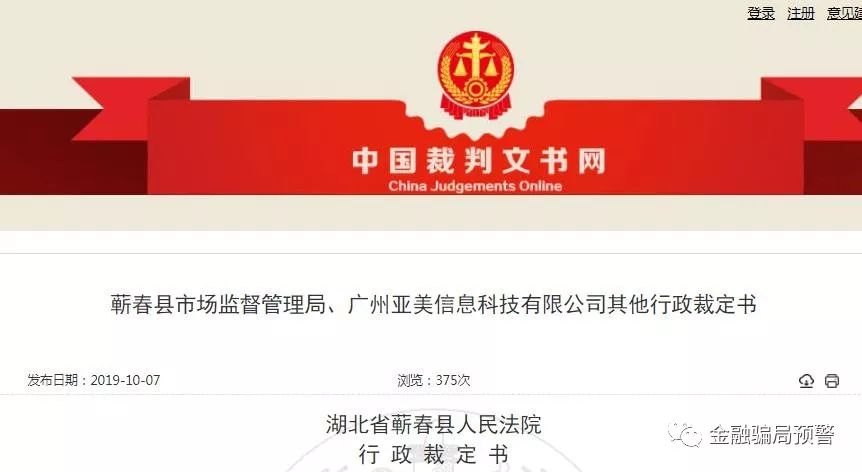 金融骗局预警还获悉,10月7日,中国裁判文书网发布的行政裁定书显示,广州亚美信息科技有限公司(以下简称:广州亚美公司)等10家公司在金融机构使用的账户及在第三方支付平台使用的帐户被湖北省蕲春县人民法院予以冻结。