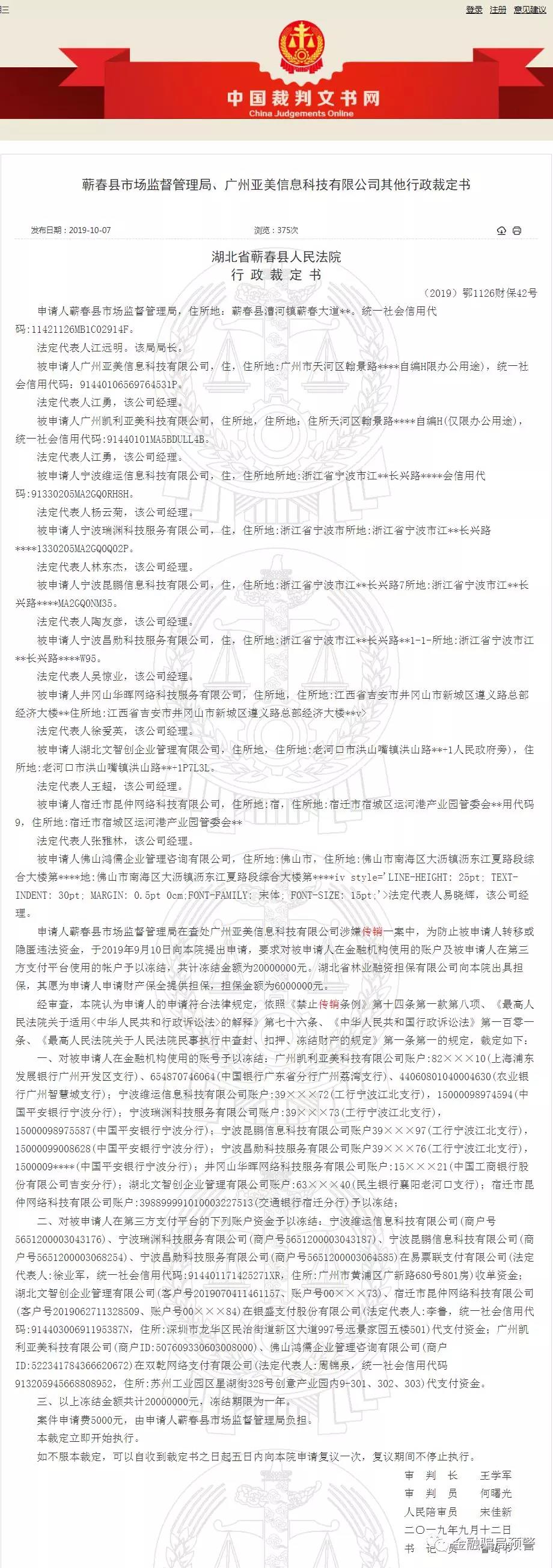 金融骗局预警还获悉,10月7日,中国裁判文书网发布的行政裁定书显示,广州亚美信息科技有限公司(以下简称:广州亚美公司)等10家公司在金融机构使用的账户及在第三方支付平台使用的帐户被湖北省蕲春县人民法院予以冻结。经金融骗局预警统计共涉及到22个相关的金融账户。