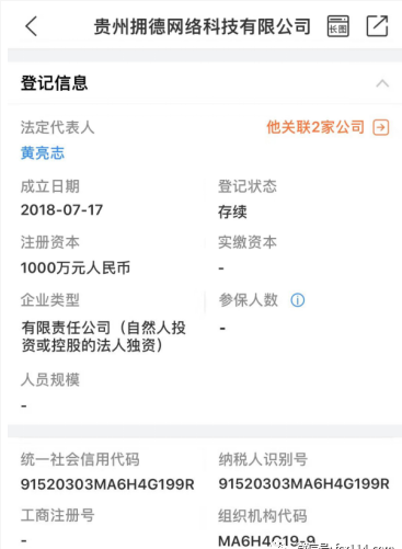 通过“天眼查”查询,贵州拥德网络科技有限公司于2018年7月17日在贵州遵义市汇川区市场监督管理局登记注册,注册资本1000万人民币,公司法定代表人黄亮志,监事曾凡永(也是该平台的实际操控人),公司注册地址在贵州省遵义市汇川区人民路国投综合大楼1栋14-1号,实际运营地址在贵州省绥阳县郑家镇。