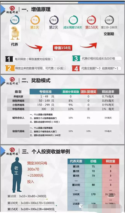 该平台已运行一年多了,按公司当初的承诺,会员在平台购鸡后158天就可供鸡或代卖,但据会员反映,目前并没有会员收到平台快递的生态土鸡,平台上所谓代卖也没有实物交易,而平台却一直在返还奖金,其奖金从何而来呢?据公司内部人员透露,平台没有交易,返还给会员的奖金都是用收后面会员的钱返还前面的会员,用滚雪球的办法维持平台运转。平台从上线至今,已发展会员7万多人,收取会员缴纳的购鸡款5个多亿,已发放会员奖金2个多亿,目前公司财务还有沉淀资金1个多亿。