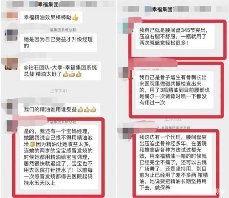 “我自己就是腰间盘3、4、5节突出,压迫右腿不舒服,用了两次就感觉轻松多了”;“代理腰间盘突出压迫坐骨神经多年,在医院和推拿店各种方法试过都无效,用幸福精油一箱的时候就已经完全不痛了,还可以去跳广场舞”;“医院治疗花十万都不保证能治好,四箱精油搞定喽,信者得福”;“两岁的宝宝感冒发烧,宝妈用幸福精油给宝宝调理,很快就退烧了,宝宝再也不用去医院打针挂水了”。本网在调查中发现,在幸福狐狸植物精油代理的朋友圈,此类精油使用反馈信息刷屏。