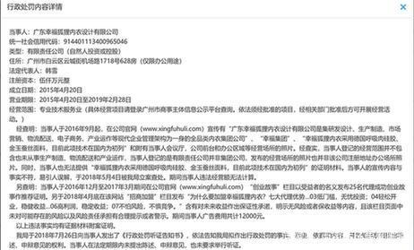 2018年8月1日,广州市白云区工商行政管理局对广东幸福狐狸贸易有限公司的行政处罚显示,当事人于2016年9月起,在公司官网宣传有“幸福集团”。经查实,当事人登记的是有限责任公司并非集团公司。