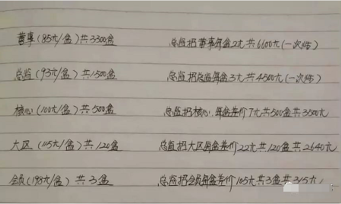 ■【总监的跨级别推荐奖】假设你是总监招到董事级别时,公司会以每盒2元返利给你,你就赚2元X3300(盒)=6600元,注意这里的返利是一次性的,以后这个董事的所有业绩均和你无关。这个时候你招的董事就要挂靠在你的上线董事下边,这个时候你的上级董事也可以拿到公司每盒2元的返利提成,即2X3300(元)=6600元。【划线部分就是实际返利制度与公司对外宣传有出入的一些地方】
