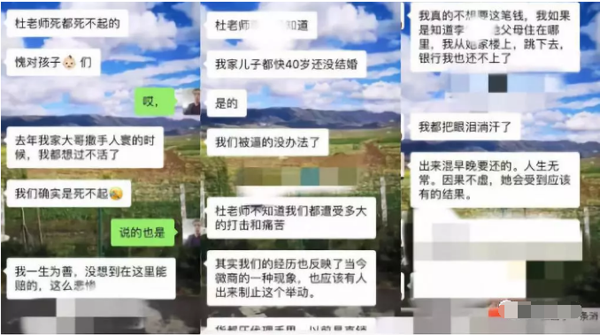 “自从代理了玛雅集团旗下的微商品牌,把我害的真的好惨!真的让我到了负债累累家破人亡的境地,如果我当初没做玛雅微商的代理,或许我的孩子也不会背负几十万的经济债务也不会影响到孩子成家,如果我没有做玛雅集团旗下的微商代理,或许我的爱人也不会在得病治疗的时候因为无钱医治选择服药结束自己的生命。可是人生没有如果,钱财没了还能再挣,生命哪能重来?我愧对我老公,我一辈子也原谅不了我自己。。。”