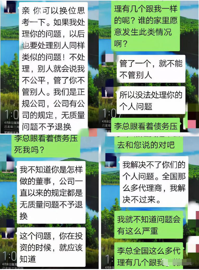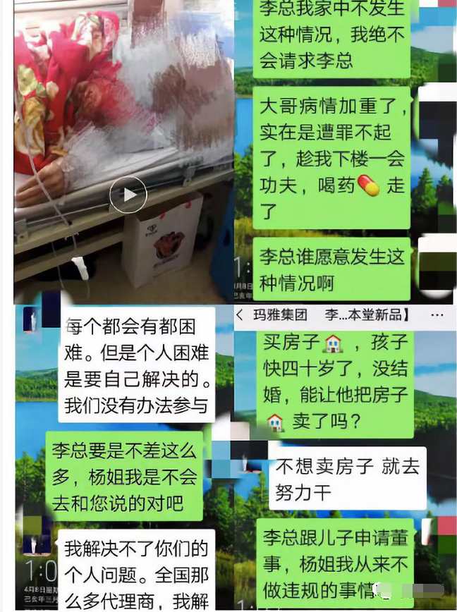 谁知天有不测风云,孩子爸爸患有直肠胰腺癌 转肝癌、肺癌晚期需要昂贵的医疗费;市场上又出现一抹瘦假货直接影响到产品量积压卖不出去。关键是客户也分不清真假产品,我通过微信多次和董事长李XX商谈给病人治病要紧,他不仅不同意还用恶语伤害我。我在万般无奈的情况下找到了我的上级老大刘XX,她说我家里有100多箱货呢,我又找刘XX的上级老大白X(现创始人级别)她说没办法,而后我又找到白X的上级老大王XX(现创始人级别)都没办法,我又找到王XX 现创始人 王某某女士告诉我等他的货出完了帮助我。不久的时间就被玛雅董事长给开除了,我是董事长李XX的第六代董事,我拿出280500元被我上级董事们层层分掉了,钱就这样的没了。