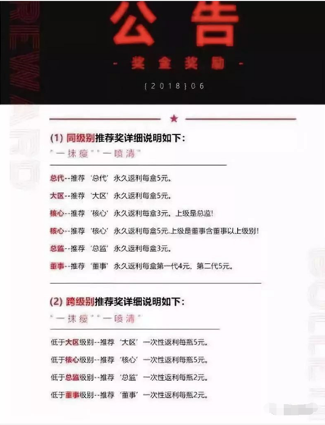 一抹瘦的代理收入大体可以归为4块:①零售赚差价 ②同级别推荐奖 ③跨级别推荐奖 ④后期补货返利(董事级别专享)