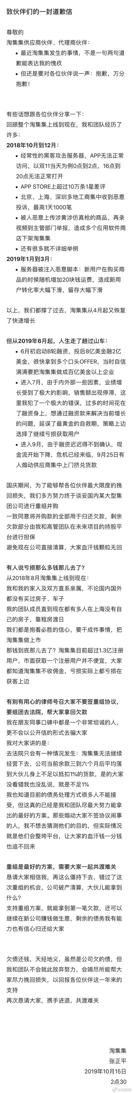 10月15日凌晨3点,淘集集创始人张正平在淘集集官方微博发布“致伙伴们的一封道歉信”。