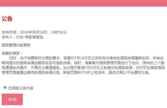 今年8月份,有涉事商家透露,淘集集向商家发布公告称将7月10日后的提现申请全部驳回。至今三个月已过,货款仍然没有到账。
