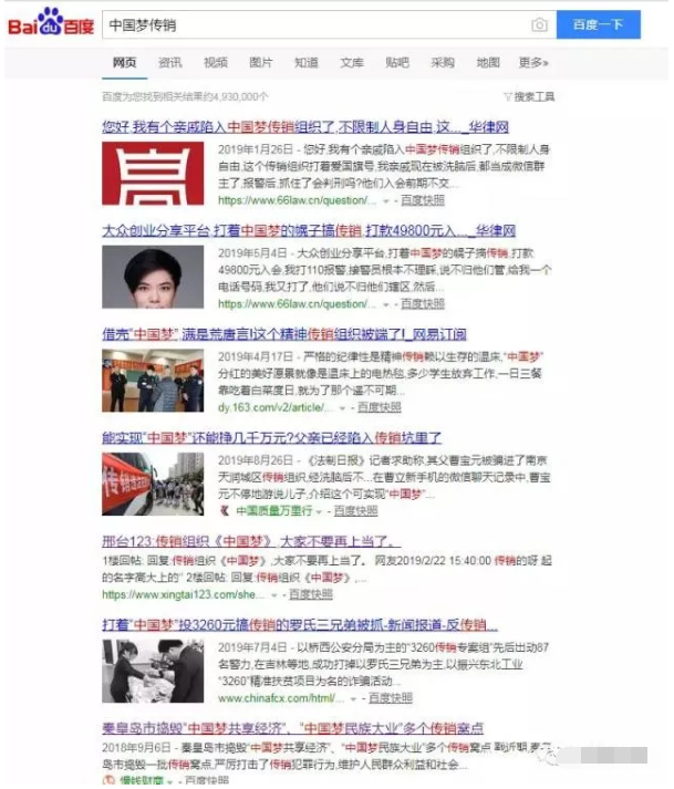 小编打开百度,随手一搜“中国梦传销”就出来整页的关于传销报道。