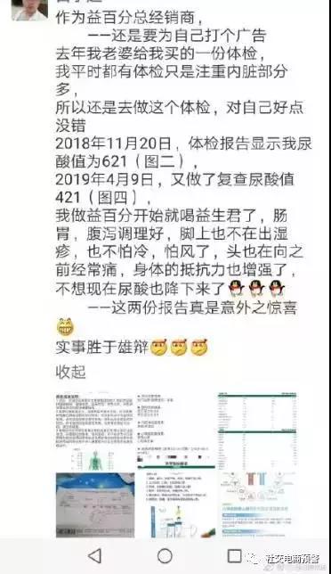 在营销层面上,益百分同样存在着夸大宣传的嫌疑,据报道,在此前益百分杭州的一场产品分享会上,一位名叫婉伶的代理向大家展示了自己用天天艾调理好多名患者的鼻炎、湿疹、咳嗽、过敏、发烧、荨麻疹等问题,案例中还不乏调理好慢性支气管炎、淋巴结肿大、牙痛、链球菌感染、降血脂等问题。