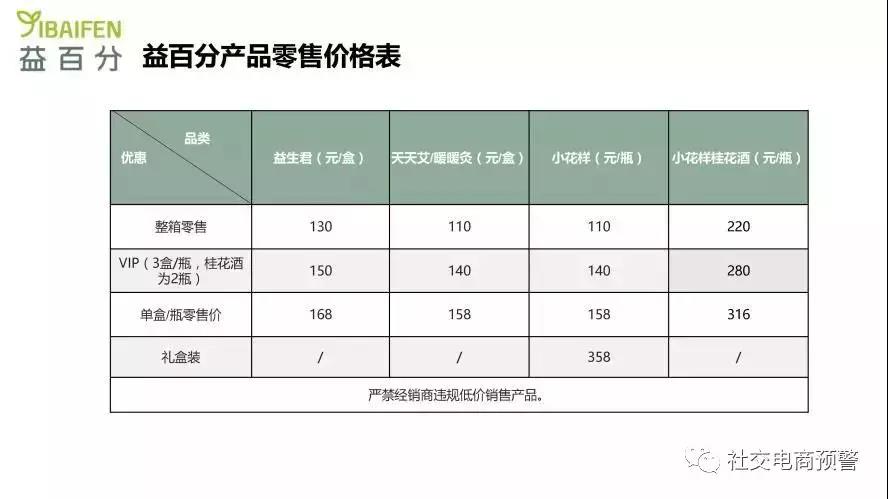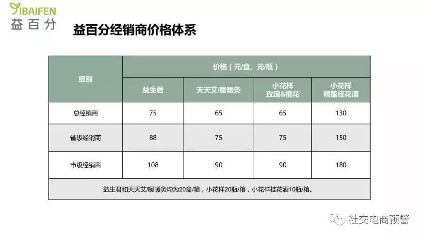 益百分的价格体系分为两部分,零售价和代理价格。目前,新入代理可以一次拿货540盒,省市联升,直接成为省级代理,连续2个月团队业绩达到2000盒可升为总代,这是益百分最高的代理级别。益百分旗下的所有产品可以混批代理,拿到代理级别后即可终身享受代理权益,没有考核要求。