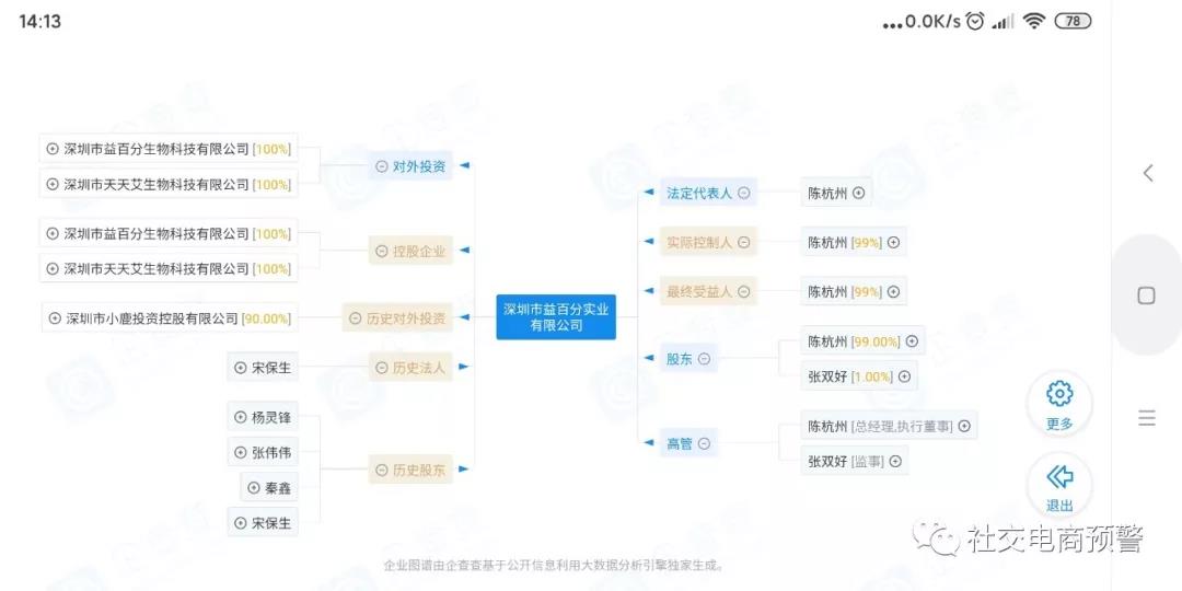法人代表、实际控股人均为陈杭州,个人在益百分实业占股99%,另一股权人为张双好,占股1%。另外,益百分实业旗下还有天天艾生物科技有限公司。