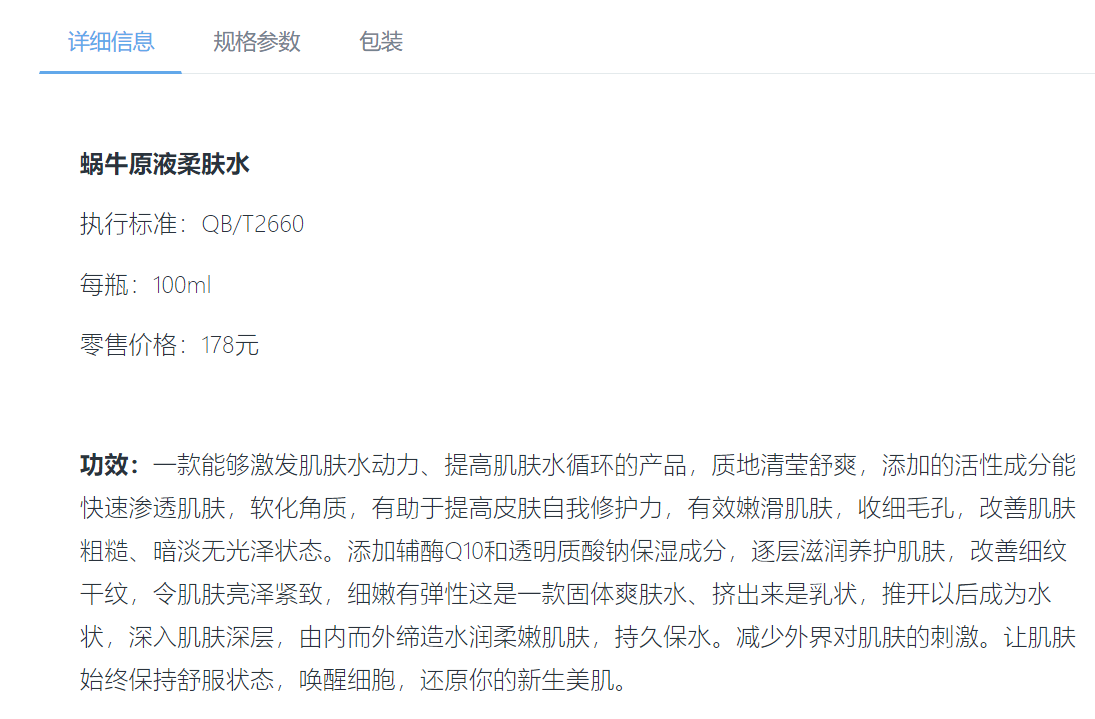 以姬存希其中一款名为蜗牛原液柔肤水为例,该产品宣称如上。本网经查询发现姬存希蜗牛原液柔肤水只是国产非特殊化妆品,但对外宣称特殊用途化妆品功效。