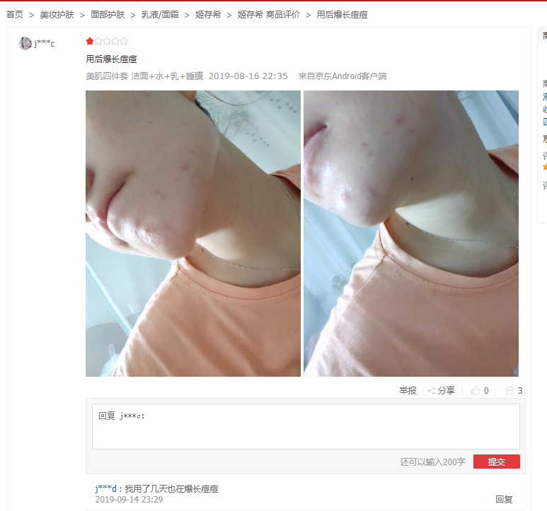除了违法广告之外,本网发现不少购买消费者反映使用姬存希的护肤品后,脸上开始长痘。