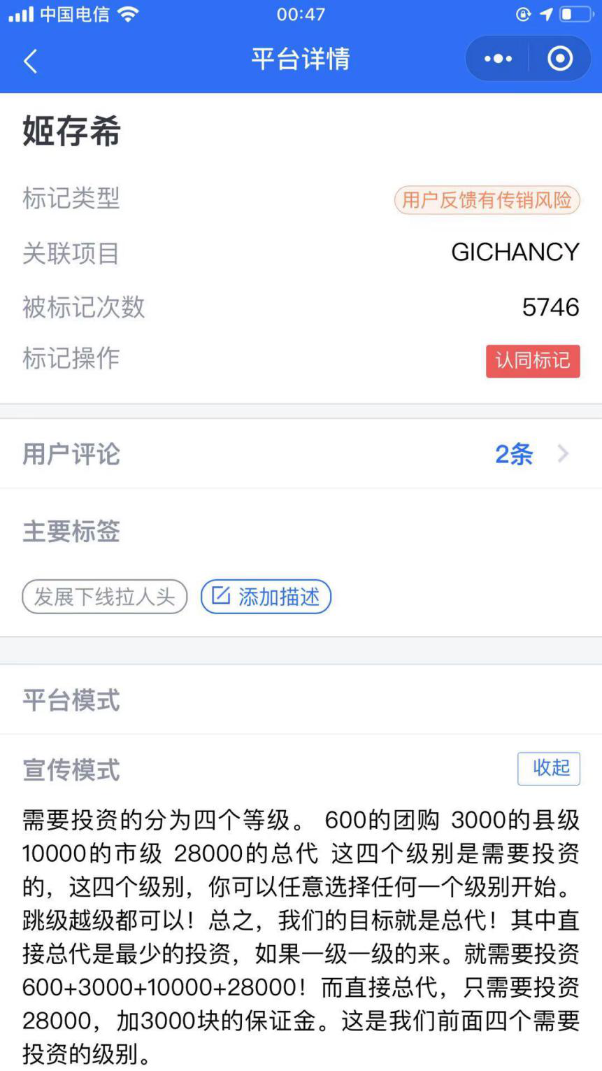 那么,姬存希的代理制度究竟是否涉嫌传销呢?本网通过腾讯灵鲲金融风险查询举报中心发现,不少用户反馈有传销的风险,认同标记次数在5746次。