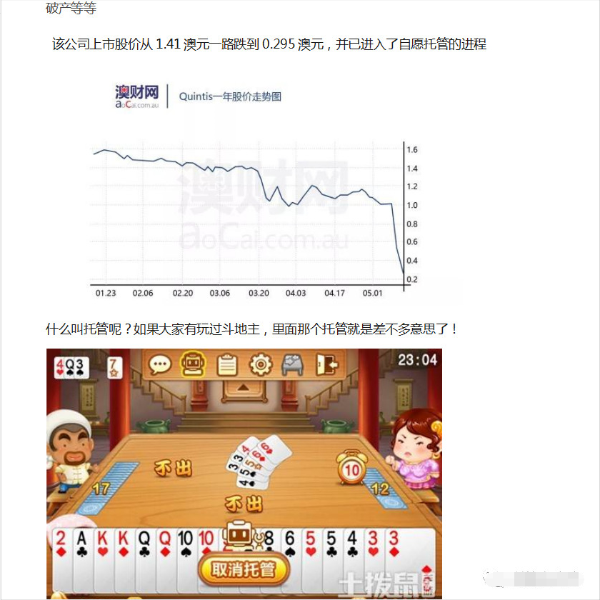 该公司上市股价从1.41澳元一路跌到0.295澳元,并已进入了自愿托管的进程