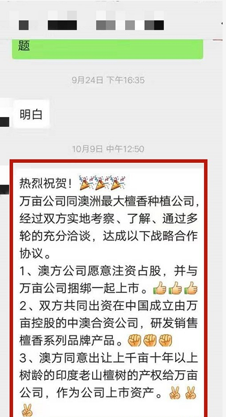 3、双方共同出资在中国成立由万亩控股的中澳合资公司,研发销售檀香系列品牌产品。
