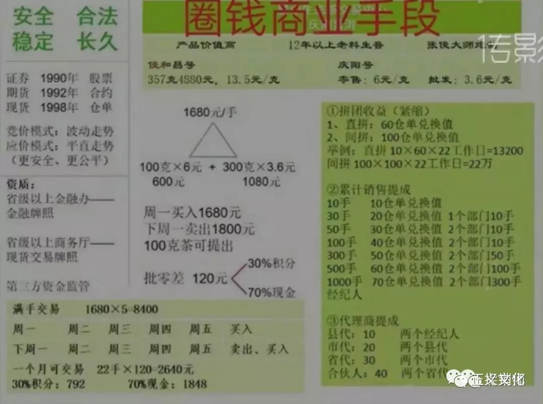 在会议上并承诺大家和市场核心,这种做法是为了更好更良性发展下去,保证一个新人不进可以运营50天左右,让大家放心投钱玩就行了,法律明确规定,不能强买强卖,公司此行为严重触违了交易法,被迫全国会员再次入金1700元,更可恨的是公司没有征求全国会员同意,非法将会员入金大于出金的人员进行非法交割,使30%会员(近1万人)帐户最低都在10200-80000元左右以上的强行变为积分,积分必须买公司高副价值的茶叶、茶多酚(茶叶1680元一饼,茶多酚2800元一盒),这种行为简值比强盗还狠毒,公司也严重涉嫌非法侵占,损害会员利益,而且公司圈了钱之后开始大变制度,以前会员每天收益120元改为30%积分,70%现金,市场奖励也统一改为50%积分,50%现金,平台也不在以庆阳潽洱为道具了,直接买一饼茶,卖一饼,也不给消费会员茶了,演变成纯正的金融诈骗手段了,公司这种行为全完全涉嫌集资诈骗罪、强迫交易罪、虚假宣传罪望政府职能部门重视,把这些挂着羊头卖狗肉的诈骗犯,绳之于法,还全国4万会员公道。