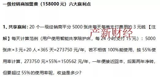 邦尼(天津)健康科技有限公司所包装的产品叫“U邦尼智能共享陪护床”,以招募一级、二级经销商的模式拉人。从该公司的市场政策可以看到,一级经销商的加盟费用为158000元,而加盟后的回报则非常凶猛。按照该公司的介绍,加盟后经销商可以获得“共享盈利”,也就是20个经销商瓜分5000张床铺每天的“收益”。每年光这笔收益就有273750元,如果加盟商不相信,按照55%的使用率也有150562元一年,一年回本两年净赚。