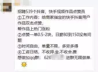 "抖音点赞员,点赞一单0.5元—2块,日薪80—150元没问题,时间自由,单量不限,多劳多得,工资日结。"这样的信息在各大兼职网上经常能看到,小王试着了刷了一单,果然得到了“兼职费”,对方告诉小王,如果入了会员并购买一款价值288的某软件VIP工作后台,以后再接到点赞任务每一单给的佣金会比之前多,工作也会变成终生制,以后不再收取费用,随时可接单。实际上,当受害人购买完某软件后,骗子又会引导受骗者交其他各类费用。