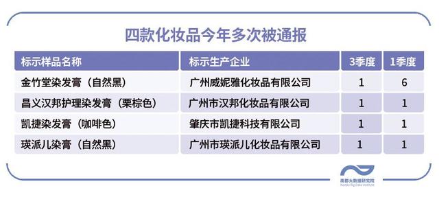 三季度药监部门的不合格通报共涉及58款化妆品,其中标示为广州威妮雅化妆品有限公司的金竹堂染发膏(自然黑)、标示为广州市汉邦化妆品有限公司的昌义汉邦护理染发膏(栗棕色)、标示为肇庆市凯捷科技有限公司的凯捷染发膏(咖啡色)、标示为广州市瑛派儿化妆品有限公司的瑛派儿染膏(自然黑)等四款化妆品今年一季度也曾被通报过。其中,金竹堂染发膏(自然黑)今年1月曾有6批次登上国家药监局的通报黑榜。