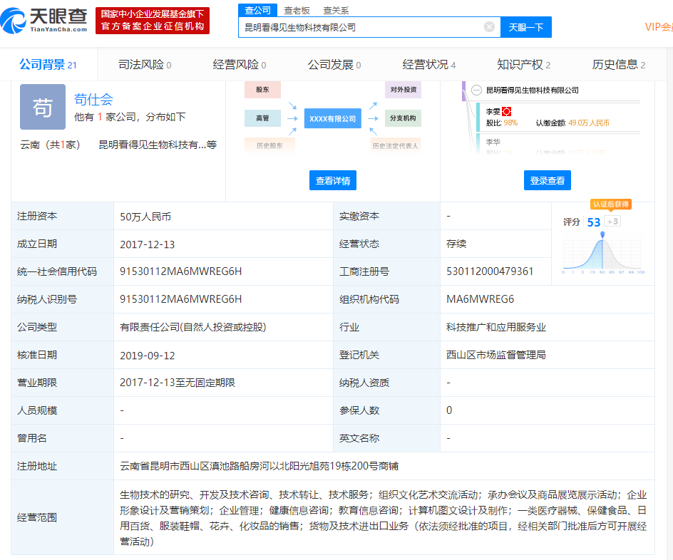 通过百度搜索和天眼查得知,阳光怡然护眼眼罩的经销商是昆明看得见生物科技有限公司。该公司成立于2017年12月13日,公司的法人代表是苟仕会,注册地址在云南省昆明市西山区滇池路船房河以北阳光旭苑19栋200号商铺,注册资本50万。