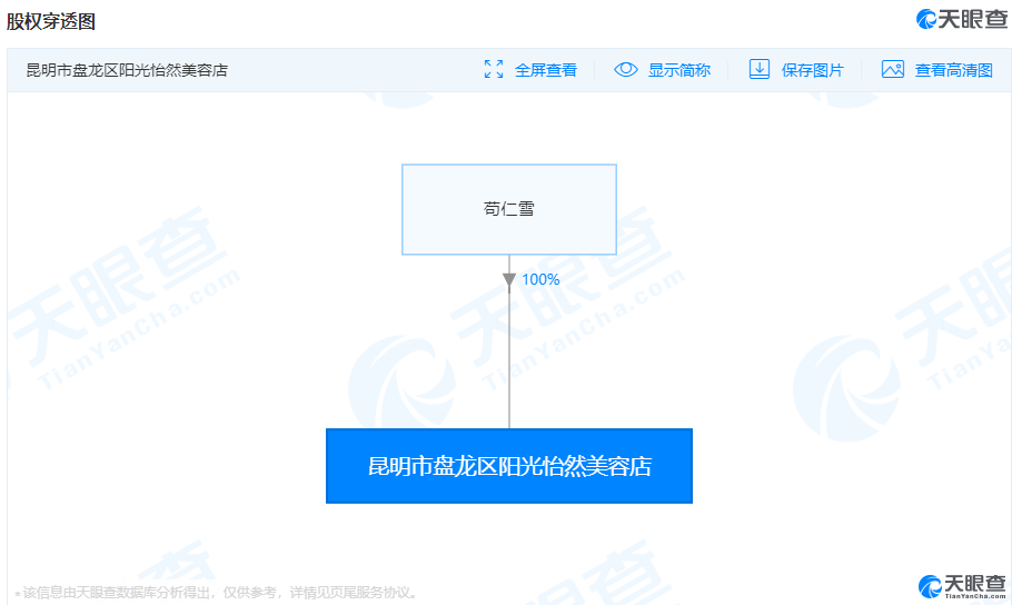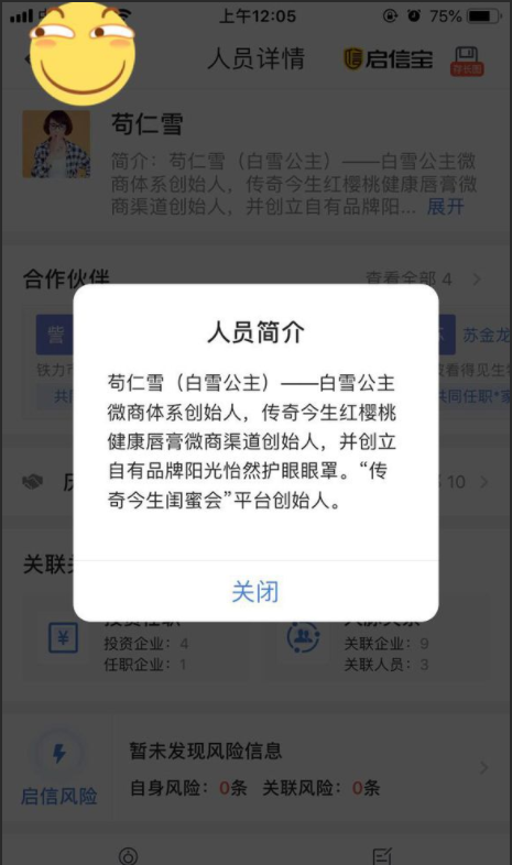 通过天眼查可以看到昆明市阳光怡然美容店的创始人是苟仁雪,也就是阳光怡然护眼眼罩官方宣称的“白雪公主”。苟仁雪是何许人也?网上关于她的宣传还真不少,据说她是白雪公主微商体系创始人、传奇今生红樱桃健康唇膏微商渠道创始人、并创立自有品牌阳光怡然护眼眼罩、“传奇今生闺蜜会”平台创始人。