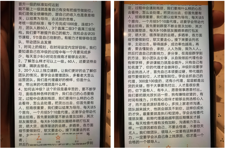 参与者都是先被其好友发朋友圈诱惑去了解,然后被拉入群里去了解商机被一步步套路洗脑拿货成为代理的,开始都是培训商机说多大的市场,然后虚假宣传产品的神奇之处。一开始听课就是发展成二级代理,如果不成就尽量发展成为三级或者四级代理。发展为四级的代理就提供素材发朋友圈,若真有被广告欺骗的顾客,就背后手把手教怎么回复消息,利用新加入不懂的代理欺骗他的朋友。还美名其曰是手把手帮销售说是自己负责任的领导。只要能帮新人卖出一盒眼罩,然后让新人在群里发出销售记录,全群大部分人都来给他祝贺,高级人员还在群里发个1元红包给大家做福利。然后又开始造势说市场多大,领导多负责。然后又继续洗脑多拿货成为高级别代理。真正拿货成为二级或者三级代理之后,就告诉你真正赚钱的方法不是靠零售。每个人朋友圈才有多少个朋友,而且也不会每个人都天天需要买眼罩,真正赚钱的方法是招商。然后说一盒盒的卖才能赚多少钱,然后把进货制度拿出来给别人做算账法,招一个代理比卖好几盒赚的都多了。那么别人会问那要怎么招商呀,去朋友圈和朋友一个个去说吗?当然不是,然后就说那当时你是怎么加入这个团队的,还不是看到我们明天朋友圈都发货都在赚钱,你才过来加入我们的吗?那么新代理手下没有代理怎么天天发货天天有人来拿货打款呢?这时候上家就传授正在的套路了。让新代理下载一个手机软件“微商截图王”然后教怎么制作假的聊天记录,假的转账截图,假的售后反馈。然后发一些在快递公司拍摄的发货视频。然后让新代理每天发什么样的聊天记录,然后假的反馈假收款截图等,还有发全群共用的发货视频,包括发朋友圈的的时段朋友圈的文字内容都是上级先审核过的,不通过上级要帮改。或者制作假图有漏洞上家有义务要帮忙检查。所以这个平台所有的盈利方式根本就不是靠销售赚钱,实实在在的拉人头模式。但凡里面有不受控制不按时或按方式发朋友圈的代理,一律放弃再带,然后踢出微信群。并且不予退货。然后还会把货的条形码黑掉,客户要是买了扫码也是黑货,显示不是正品。