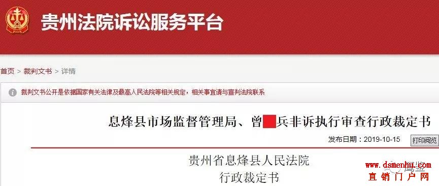 鹰鉴从贵州法院诉讼服务平台了解到,贵州省贵阳市男子曾某兵推销“宇飞来”手机和“酷聊”软件发展人员的行为因构成传销,被息烽县市场监督管理局罚没近60万元。近日,贵阳市息烽县人民法院准许息烽县市监局强制执行该处罚决定。