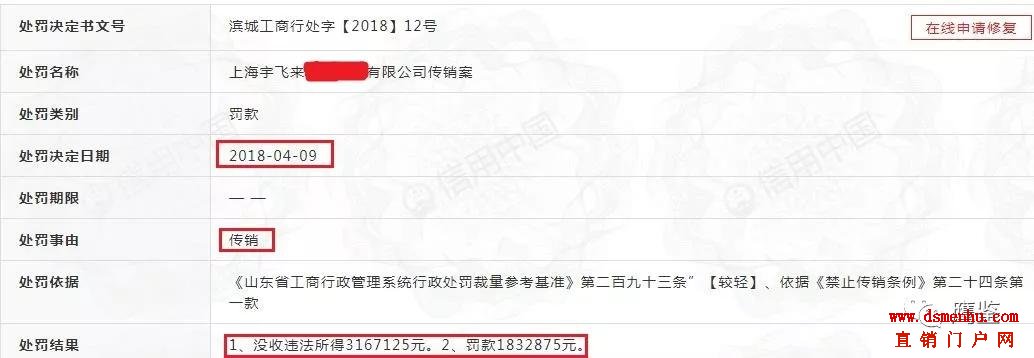 鹰鉴从国家发展和改革委员的信用中国网站上了解到,“宇飞来”手机和“酷聊”软件的主体公司因组织、策划传销,在2018年4月9日被山东省滨州滨城区工商局依据《禁止传销条例》的规定,没收其违法所得316万余元,并罚款183万余元。