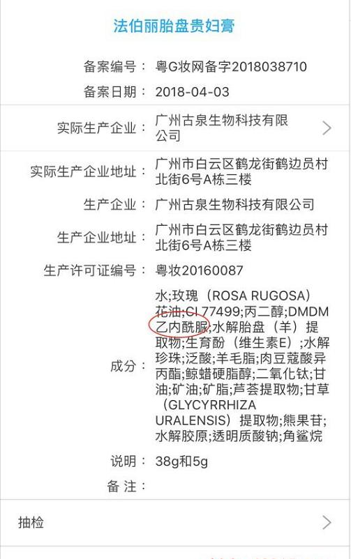 另一方面,在国家食品药品监督管理局网站查询发现,法伯丽胎盘贵妇膏的备案信息显示,法伯丽贵妇膏含有DMDM 乙内酰脲成分。