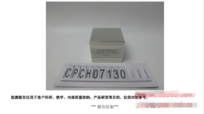 消费者带着购买了法伯丽胎盘贵妇膏,并将此款高价化妆品拿到权威部门检测发现,法伯丽贵妇膏并检测甲醛单项判定为“符合”,但测试结果一栏中的数值显示为“69”。这意味着,法伯丽贵妇膏虽然符合国家规定的甲醛标准范畴,但其产品中仍然含有甲醛成分。
