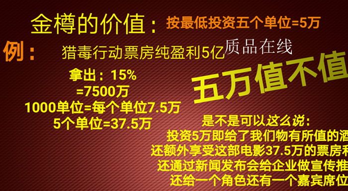 赖世山影业的投资方案书显示,电影《猎毒行动》的投资分为金惠财富、金樽财富、金将财富、金冠财富四种,每一种基本都要求投资5万以上,每一种投资方案都以高额影片分红为噱头,吸引会员投资参与。质品在线看到,金惠财富采取保本付息模式,投资后18个月就会返本,此外还可以获得影片利润10%的分红,该公司还举了例子,投资1万元,18个月后回本1万元,票房分润可以达到5万元。